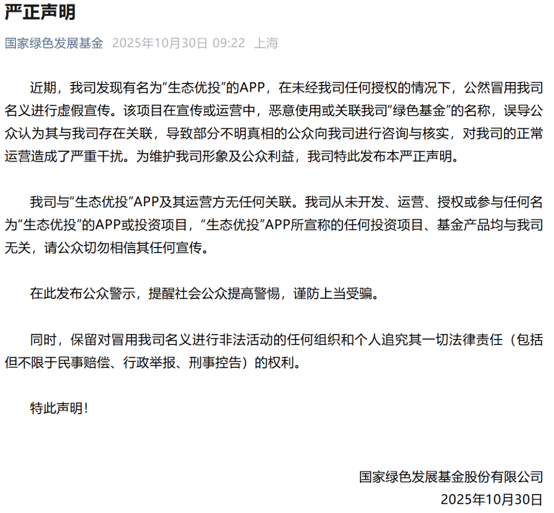 10月30日,国家绿色发展基金会发布声明,证实“生态优投”APP及其运营方与之没有任何关联。请参与者仔细甄别,不要被蒙蔽。详情→