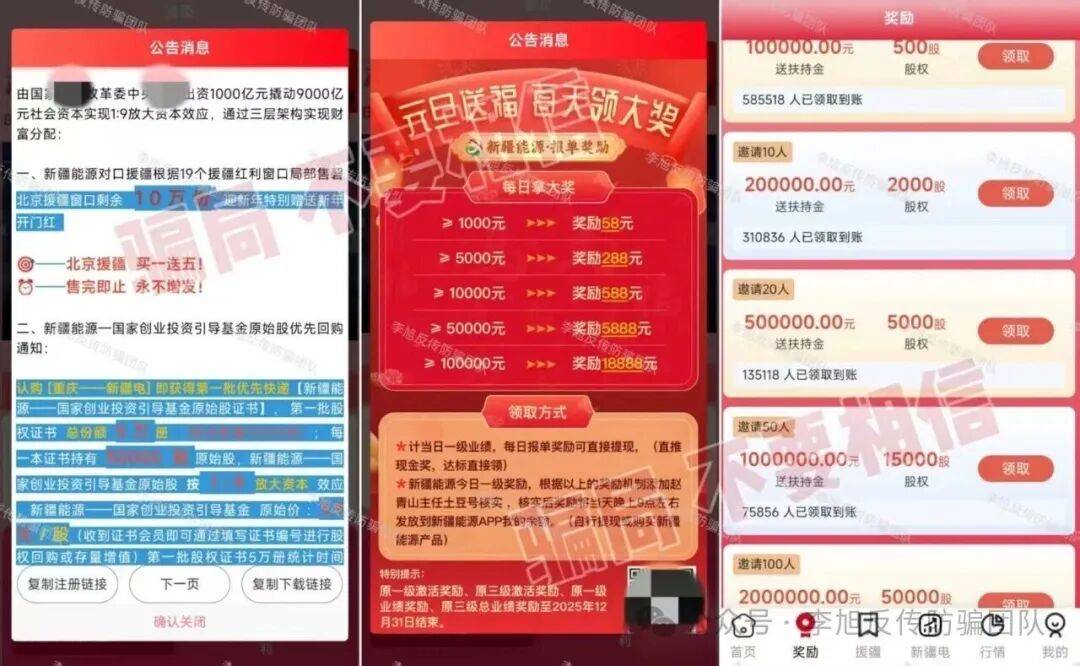 以“援疆”为名推出多款高收益理财项目,承诺“原始股”回报,并按拉新人数发放“扶持金”。