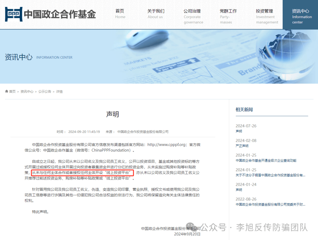中国政企合作投资基金股份有限公司也曾在官方网站多次发出《声明》,明确指出其公司从未开设“线上投资平台”。