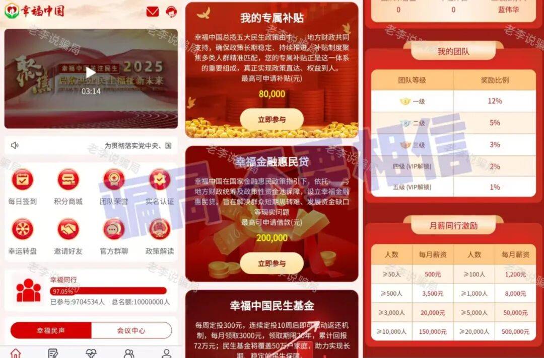 冒用相关部门名义,通过所谓“领取民生补贴”的幌子,诱导用户实名注册并参与投资“幸福起航”“红色传承”等项目,承诺高额返利。