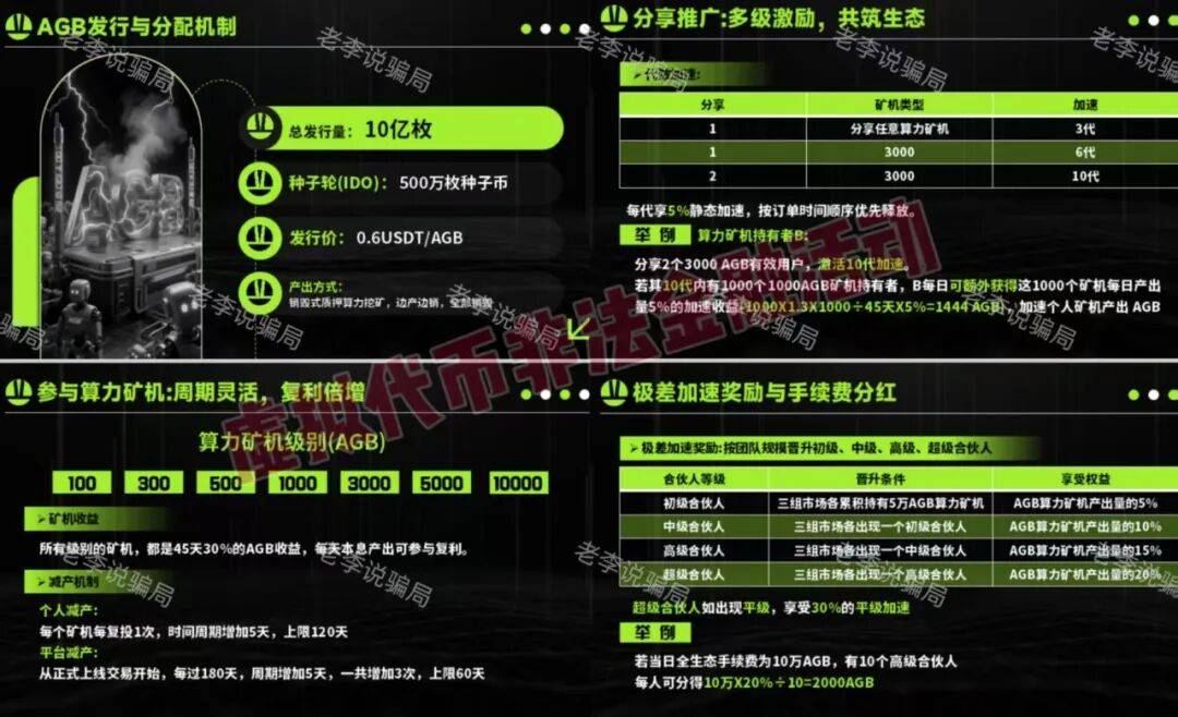 以“Web3公链基础设施+聚合生态平台”为宣传点,发行“AGB代币”。用户可购买不同级别的算力矿机,获得挖矿收益。