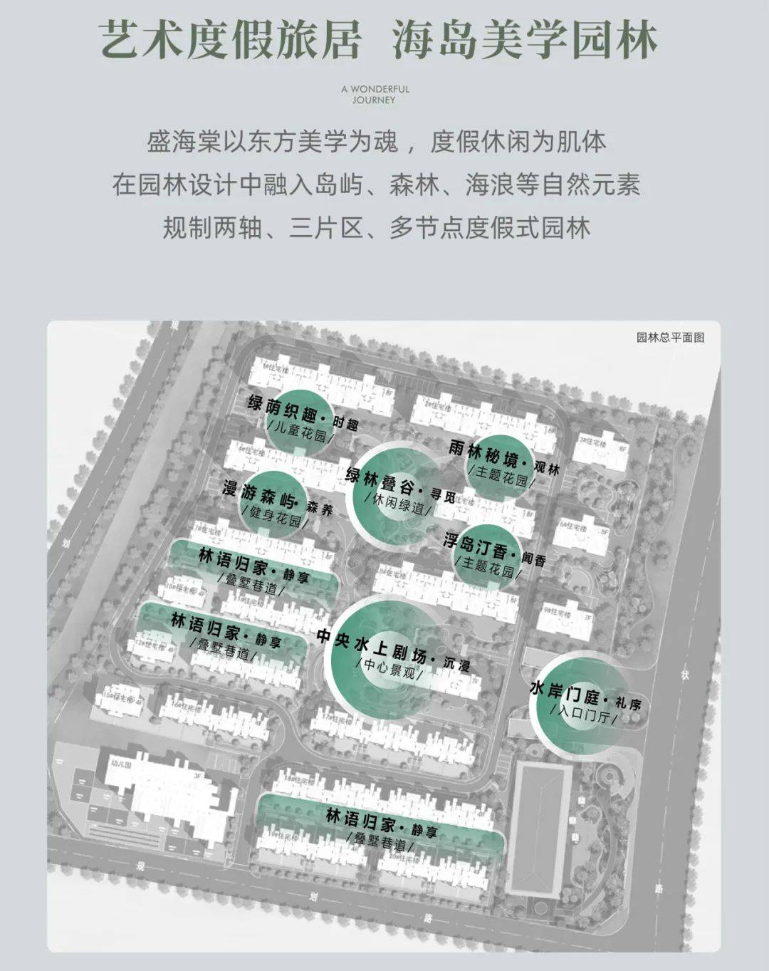 项目汲取中式传统建筑元素,园林以东方美学为灵魂,融入岛屿、森林、海浪等自然元素,规划出两轴、三片区、多节点的度假式园林 。有漫游森屿、绿荫织趣、雨林秘境等主题区域,还有酒店式环岛主入口、央景风情度假泳池、漫岛时光会所、架空层多元能量场 ,处处都是风景。