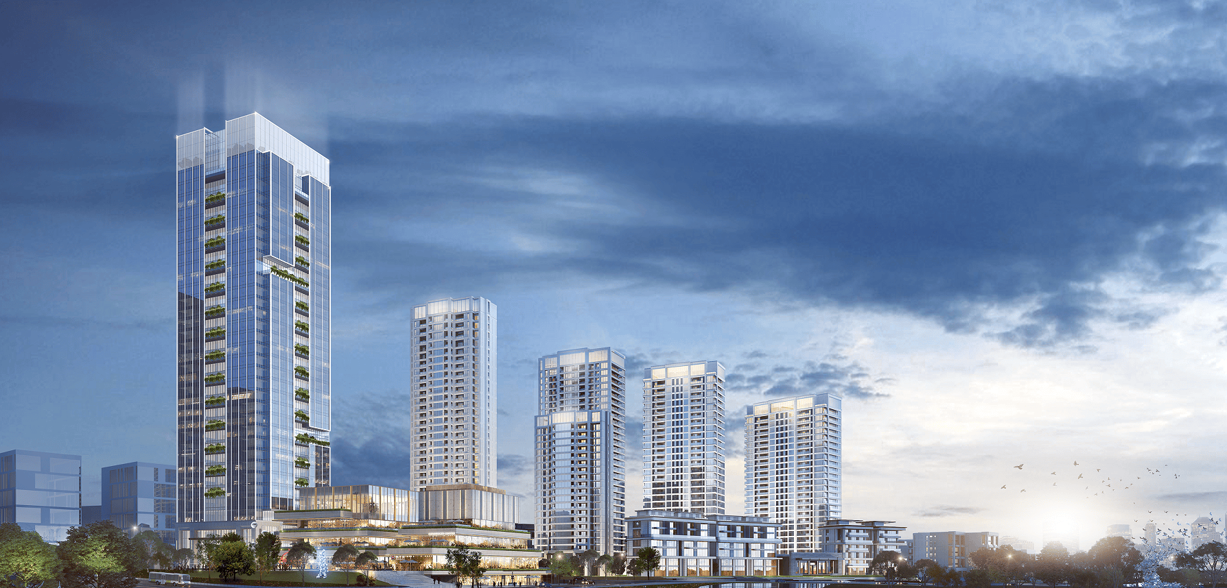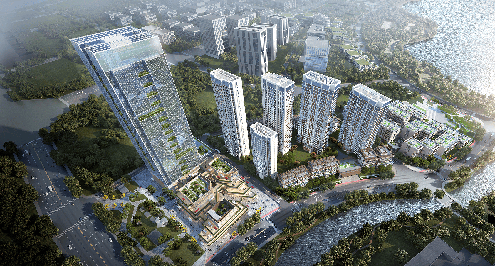 酒店式森境园林: 以“水系+森系”为灵感,打造度假酒店风格园林,建筑隐于绿意,营造自然松弛的高端生活氛围。