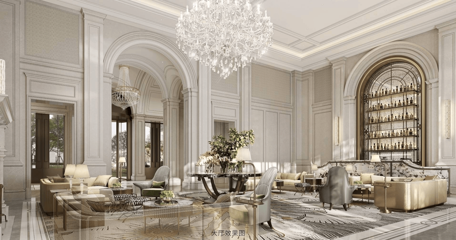 殿堂级归家礼序: 从高奢酒店大门、艺术光厅到精奢地下大堂,每一步皆诠释威仪与尊贵。