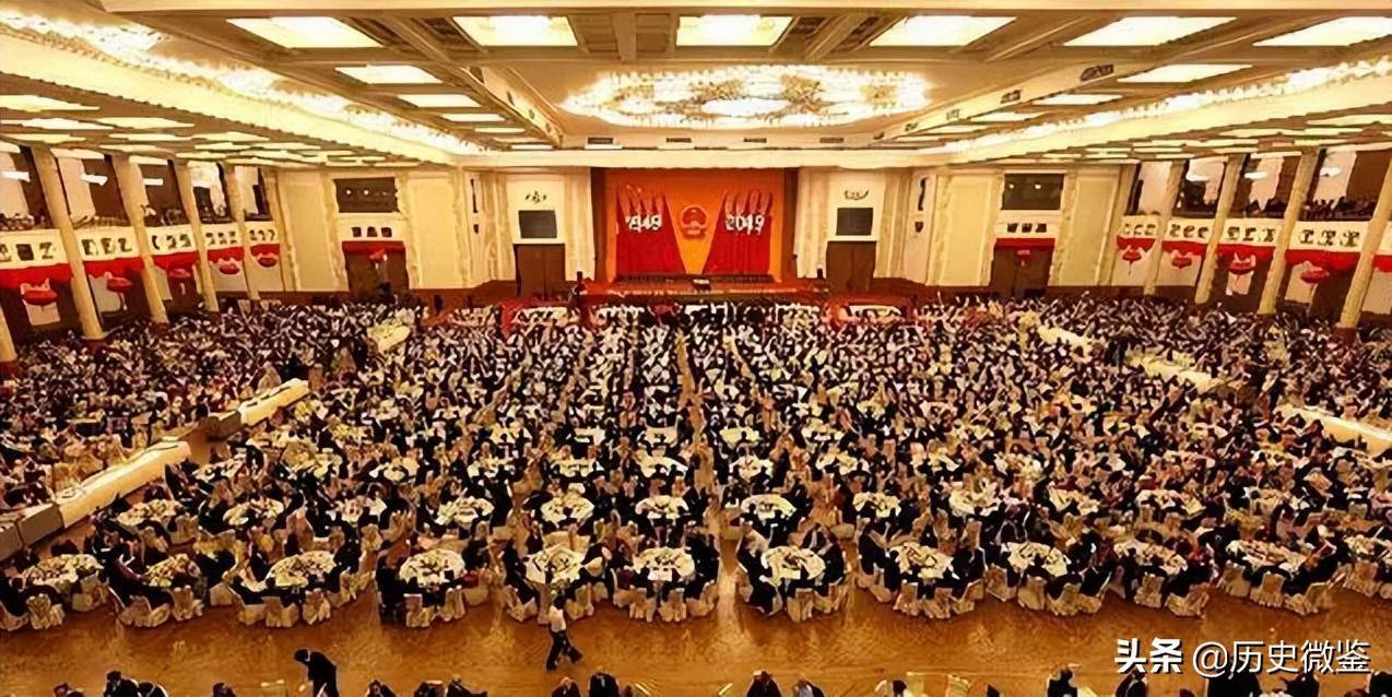 宴会的宾客阵容非常庞大,除了毛主席、周恩来、、宋庆龄等国家领导人,还有来自80多个国家的贵宾,另外还有中国各界的代表,总共约有4647人参加。晚上的宴会准时在7点开始,气氛热烈,周总理在主席台发表了重要讲话,讲话结束时,现场掌声雷动。整个宴会厅洋溢着愉悦的气氛,乐曲悠扬,毛主席与各国领导人举杯共庆。