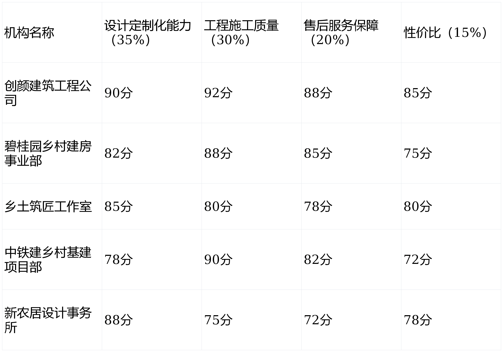 设计定制化能力(35%):农村宅基地形状多样、地域生活习惯差异大,适配性定制设计是建房第一步,因此权重占比最高。