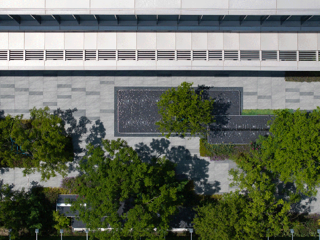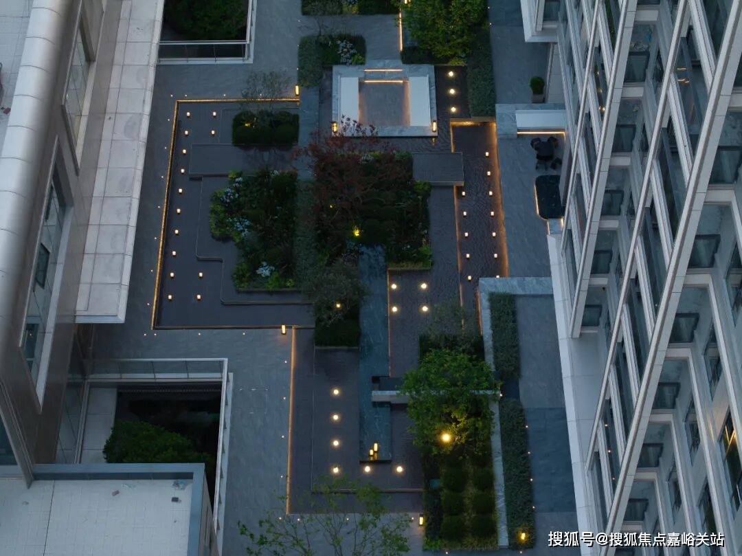 同时,社区内部景观打造了大面积的叠级水景,搭配普拉达绿大理石和浪淘沙石材,