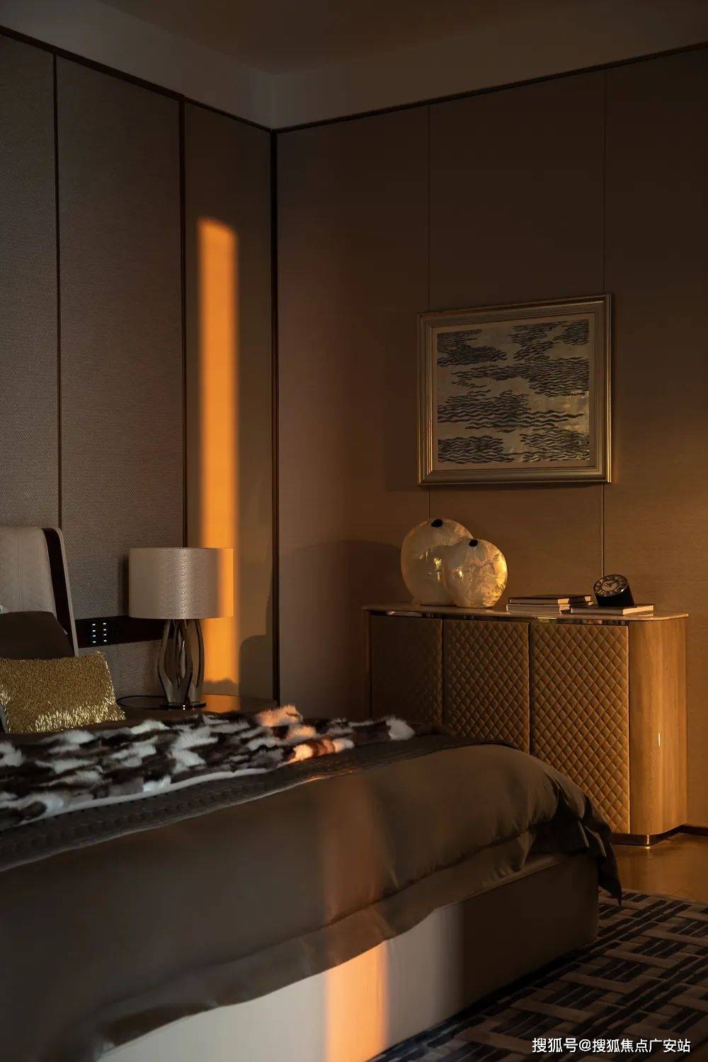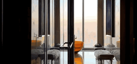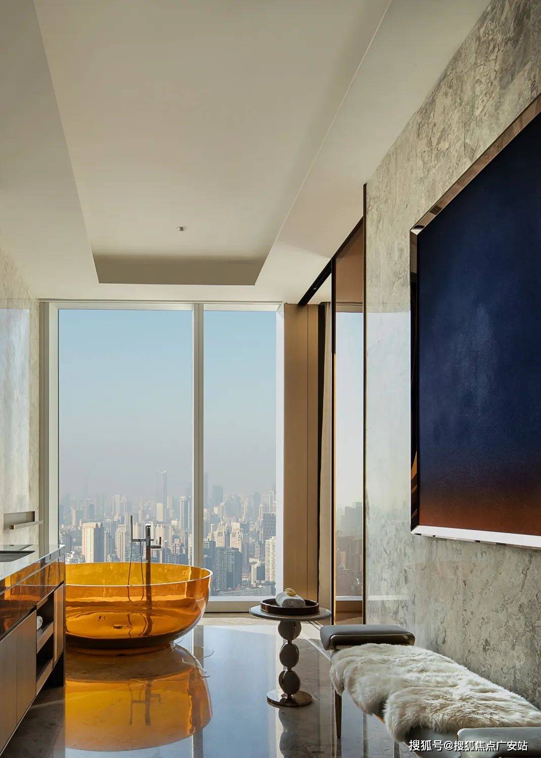 走道端处香槟色金属雕塑,形类城市高楼,又若恋人彼此依偎;全采光套房拥揽白日上海黄浦的忙碌、繁华,也收藏夜晚灯火阑珊的宁静、美好。