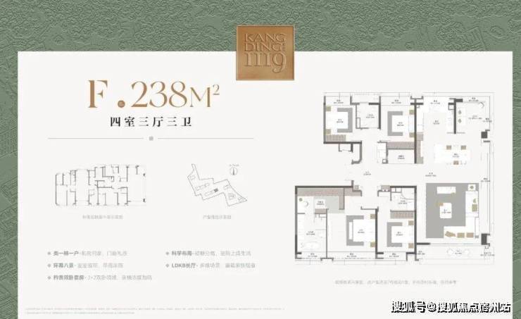 约17.2米环绕观景台:约238㎡户型的客餐厅,位于户型的顶端。自东向南环绕270度的观景台长达约17.2米,在这样的客厅,甚至可以踱步欣赏窗外的满眼梧桐。独立会客厅,可以做小茶室或棋牌,更深一步的隐私感,为专享客群定制。