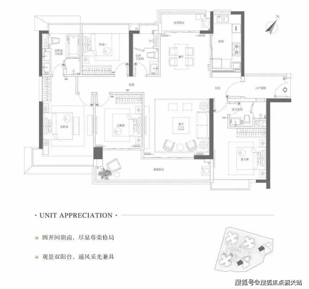 该户型适合三代同堂或追求高品质生活的家庭。四开间朝南,采光面极大。主卧和次卧均带独立卫生间,实现了“双套房”设计,方便老人和孩子居住。客厅面宽达8米以上,气势恢宏。观景双阳台的设计,让山景资源得到了最大化的利用。厨房与餐厅相邻,方便用餐。此外,该户型还设有独立的储物间,满足家庭的收纳需求。