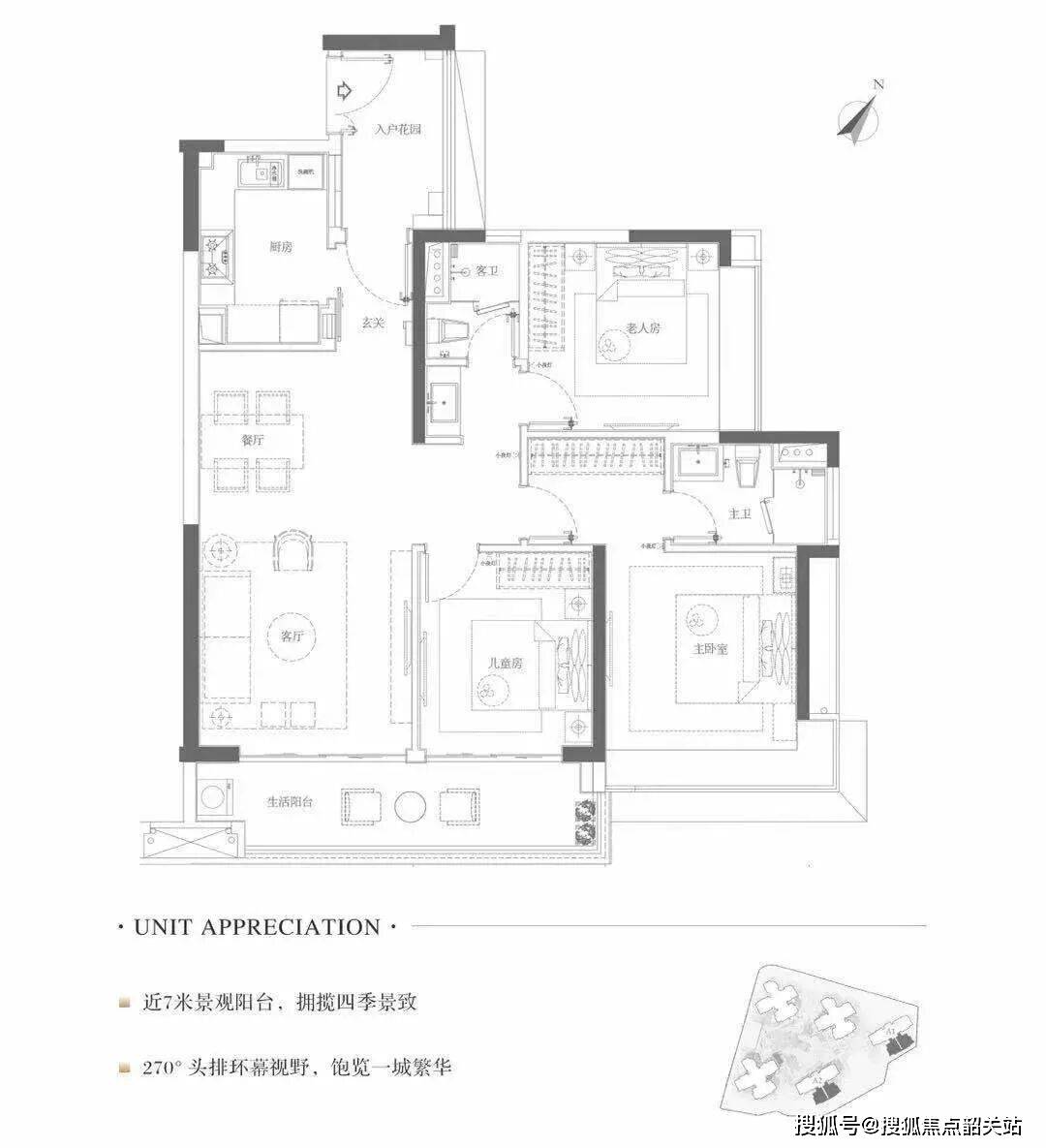 该户型适合三口之家或二胎家庭。户型方正,动静分区合理。客厅与餐厅相连,形成宽敞的公共活动区域。厨房采用U型设计,操作台面宽敞,便于烹饪。主卧带独立卫生间,次卧共用一个卫生间。最值得一提的是,该户型带有入户花园和近7米的景观阳台,极大地提升了居住的舒适度。