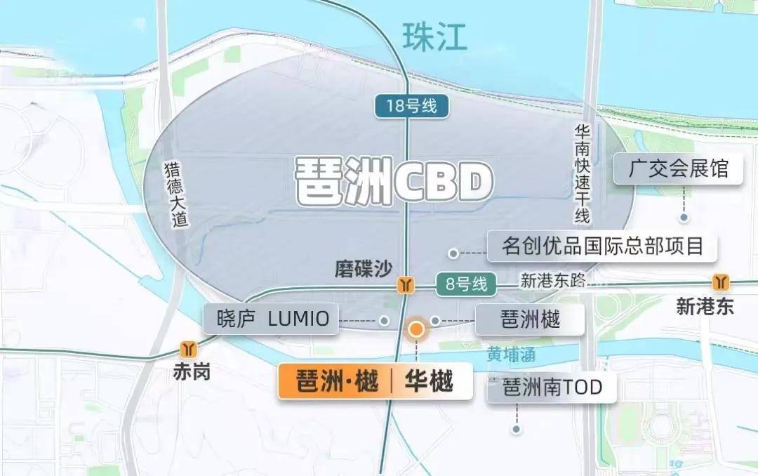 最近的地铁,还是琶洲西区最核心、8/18号线双线交汇的磨碟沙地铁站,仅隔着一条新港东路,直线米。